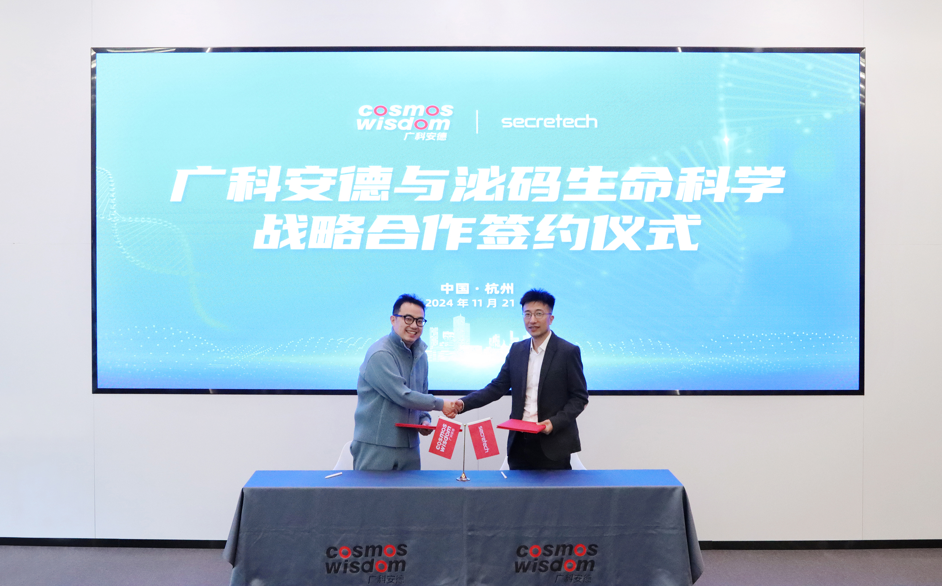 2024 年 11 月 21 日,杭州广科安德生物科技有限公司(以下简称广科安德)与上海泌码生命科学有限公司(以下简称泌码生命科学)正式签署深度合作协议,双方将充分发挥各自的技术创新与平台优势,基于泌码生命科学的核心技术蛋白组检测技术PBA(邻近编码技术 Proximity Barcoding Assay),携手推动外泌体研究与技术应用的突破性进展。广科安德 CIO 王炜欣博士与泌码生命科学创始人&董事长吴迪博士在杭州正式签署合作书。