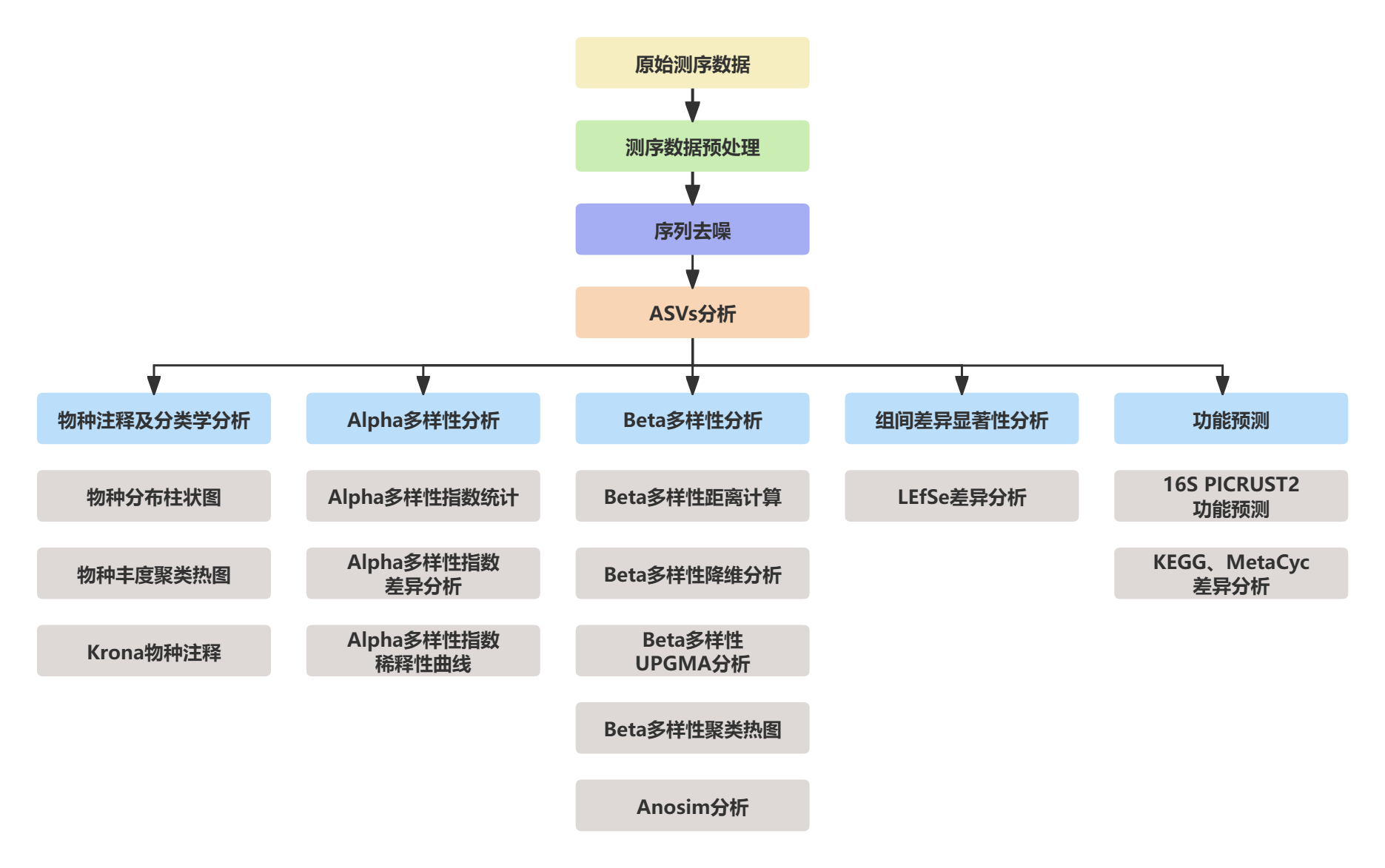 Meta扩增子测序的生信分析首先对测序原始数据进行拼接、过滤、质控,得到有效数据。然后基于有效数据进行OTUs(Operational Taxonomic Units )聚类和物种分类分析。根据OTUs聚类结果,一方面对每个OTU的代表序列做物种注释,得到对应的物种信息和基于物种的丰度分布情况。同时,对OTUs进行丰度、Alpha多样性计算等分析,以得到样本内物种丰富度和均匀度信息、不同样本或分组间的共有和特有OTUs信息等。另一方面,可以对OTUs进行不同样本或组别间群落结构差异的探究。同时,也可结合环境因素进行多样性指数与环境因子的相关性分析,得到显著影响组间群落变化的环境影响因子。