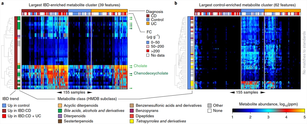 检测到的8000种特征代谢物中,鞘脂类、胆酸等在IBD中富集,三酰基甘油、四吡咯等则在健康对照中富集;超过50%显著差异代谢物难以鉴定,部分代谢物可通过相关性假定推测为某种物质。